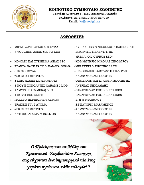 Στο πλαίσιο της εκδήλωσης πραγματοποιήθηκε κλήρωση δώρων, προσφέροντας χαρά και ενθουσιασμό στους παρευρισκόμενους. Η συνάντηση αυτή ενίσχυσε το αίσθημα της συλλογικότητας και έκλεισε με ευχές για ένα δημιουργικό νέο έτος γεμάτο υγεία και ευλογία.